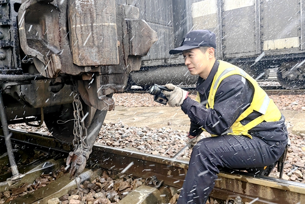 图为降雪天气职工正在进行列车检修作业