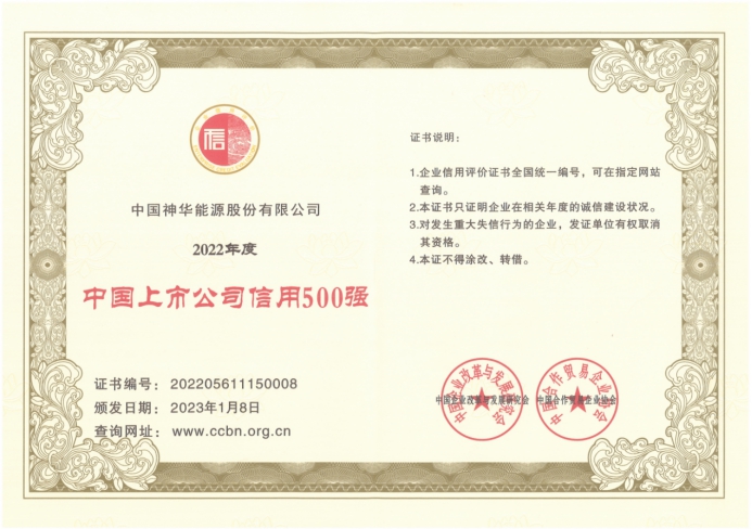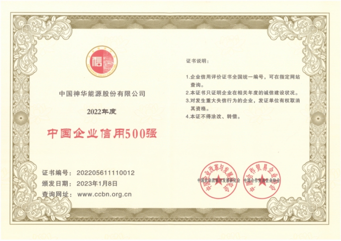 1月8日,2023中国企业信用发展论坛发布“2022年度中国上市公司信用500强”名单,中国神华位列第八,同时入围“中国企业信用500强”,并被评为“培育诚信经营、守信践诺能源标杆企业”。