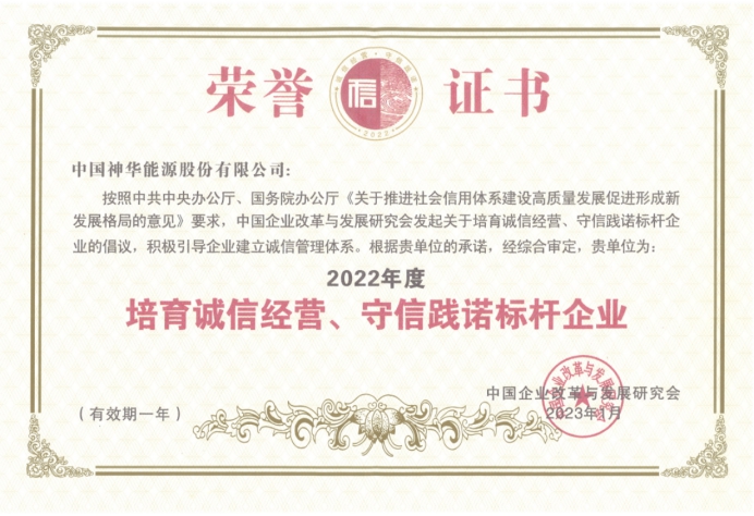 中国神华高度重视企业信用体系建设,健全组织体系、配套制度建设、加强信用管理、培育信用文化、筑牢管控手段、参加标准制定、深化信用实践,不断提升公司信用管理水平,积极打造诚信经营、守信践诺能源标杆企业,展现出强大发展韧性,有力地推动了企业高质量发展。